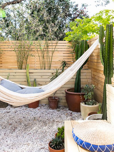 Che si tratti di un’amaca sospesa tra gli alberi o di una vera e propria area dedicata a sdraio, lettini e poltrone, rendi la tua zona lounge il più confortevole possibile, con cuscini di diversi formati, teli, crema protettiva sempre a disposizione tua e dei tuoi ospiti. (foto Pinterest @PalmettoHighway)