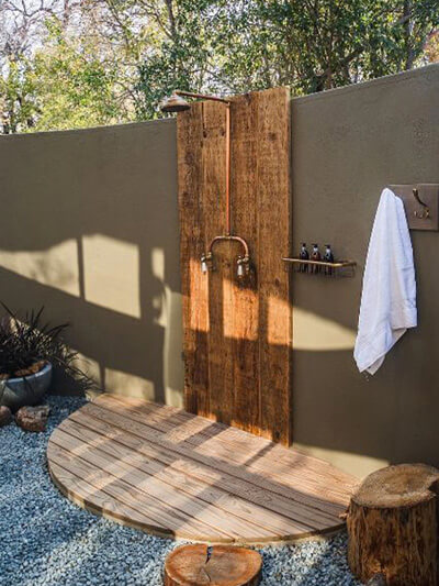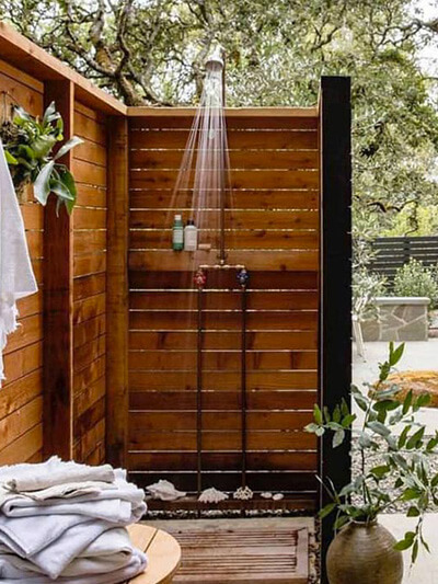 Potresti scegliere una doccia solare, che ti permette di rinfrescarti dopo il sole e il nuoto senza pesare sui consumi. Uno spogliatoio da esterno poi ti offre più intimità e praticità per cambiarti e prepararti al bagno. (foto: Pinterest @apieceofrainbow)