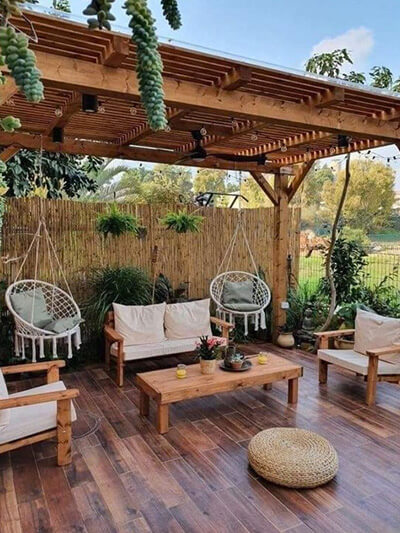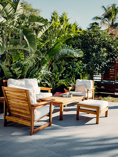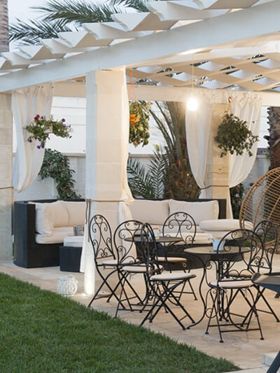 Spazio alle tinte vivaci di rosa, arancione e verde guacamole. I materiali ricordano le vacanze ai tropici come il rattan, le foglie di palma e la paglietta. Anche in questo caso per l’area pranzo potrai optare per un tavolo in cemento e creare contrasto con le sedie in rattan intrecciato. Il tocco finale per creare un mood esotico? Lanterne di bambù o in carta di riso per l’illuminazione del tuo giardino.