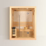 La sauna Verona si distingue per la forma rettangolare e la fabbricazione in legno di pino bianco finlandese. Lo spessore delle pareti è pari a 50 mm, in modo da garantire un isolamento ottimale e un buon mantenimento della temperatura e del calore durante le sessioni. L’accesso all’interno del modello Verona è assicurato da un’anta in cristallo temperato di 8 mm inserita nella parete con effetto panoramico, che non solo offre una visuale completa ma al tempo stesso rende la sauna Verona ancora più elegante nel suo design. Un’altra peculiarità del modello Verona è la grande parete in pietra cristallizzata che troviamo al suo interno, su cui poggiano ampie sedute larghe 50 cm.