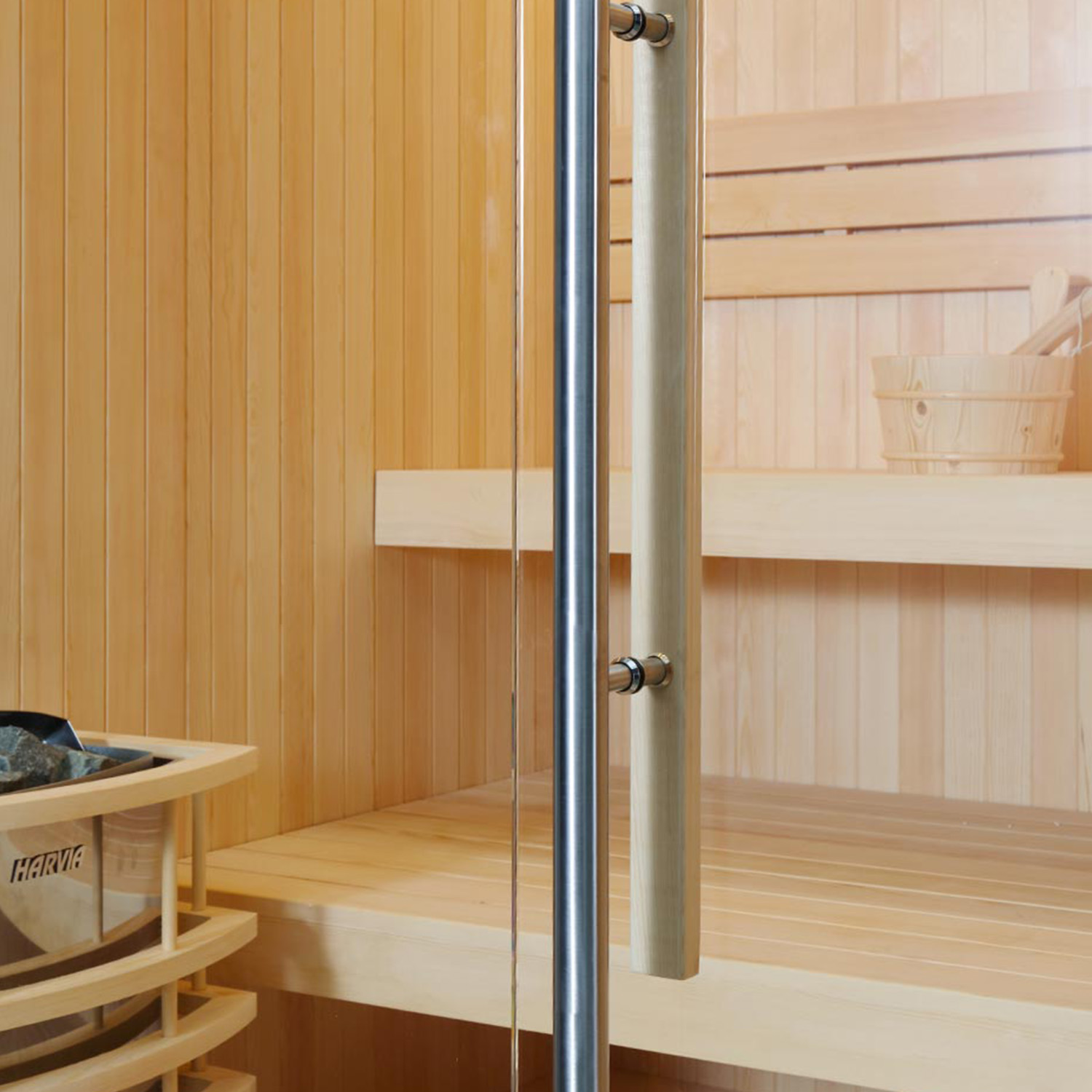 La sauna finlandese Brescia è tra i top di gamma, dalla forma rettangolare, spaziosa e raffinata. La vetrata e la porta in cristallo da 8 mm conferiscono un design moderno ed elegante.