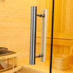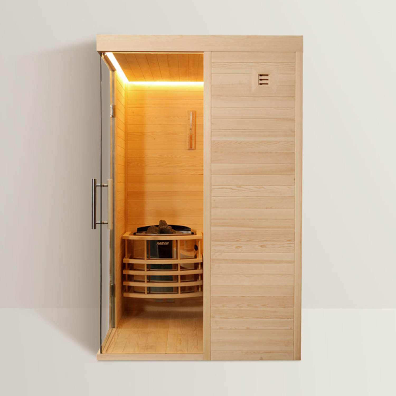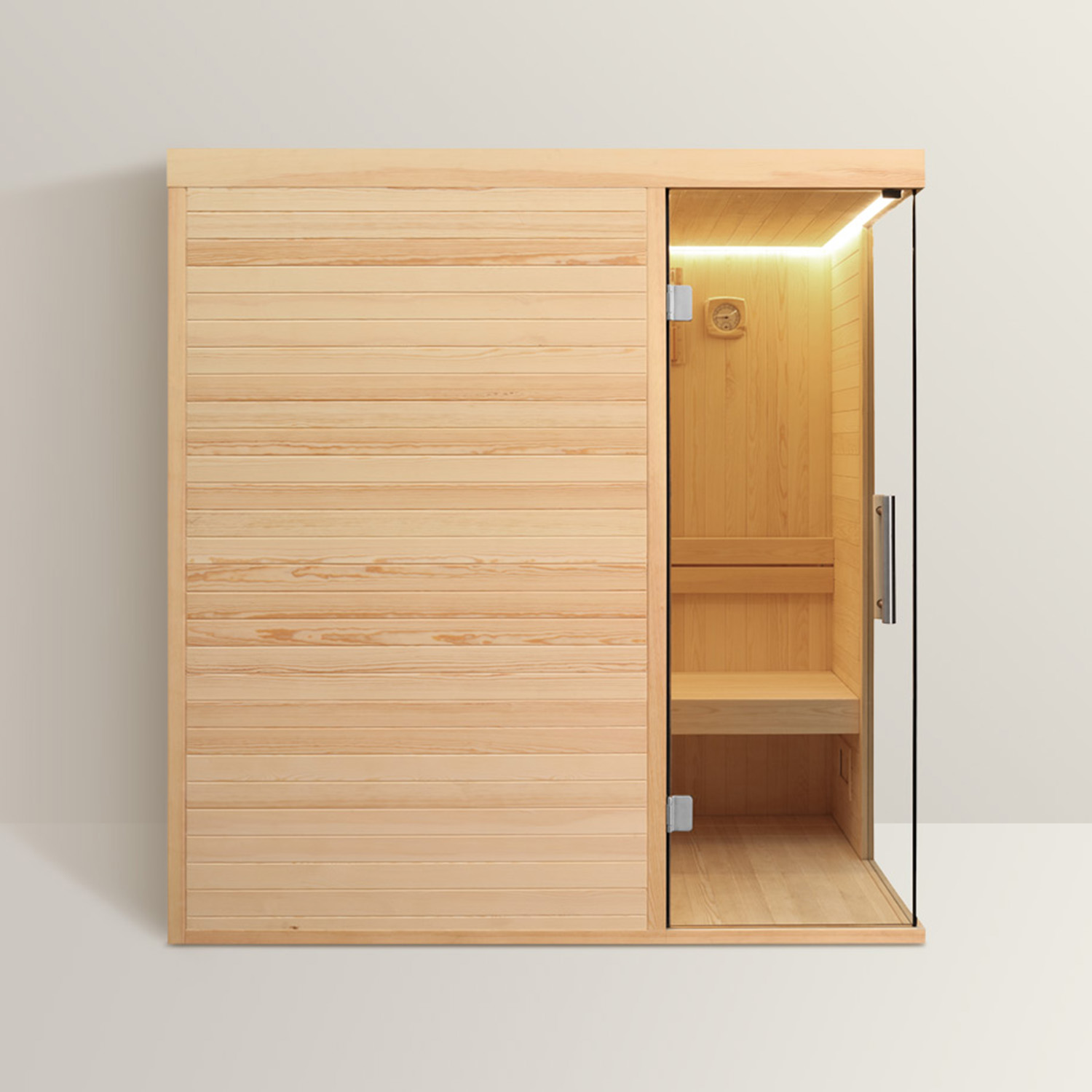 La porta di accesso forma, in chiusura, un elegante angolo retto in cristallo che rende la sauna un prodotto dallo stile ricercato, con una linea pulita e compatta e con un design raffinato. La struttura in legno di pino bianco finlandese con doghe orizzontali, la stufa con le sue pietre ollari ed il pannello comandi fanno della Sauna da casa Firenze uno dei prodotti di maggior qualità in commercio.