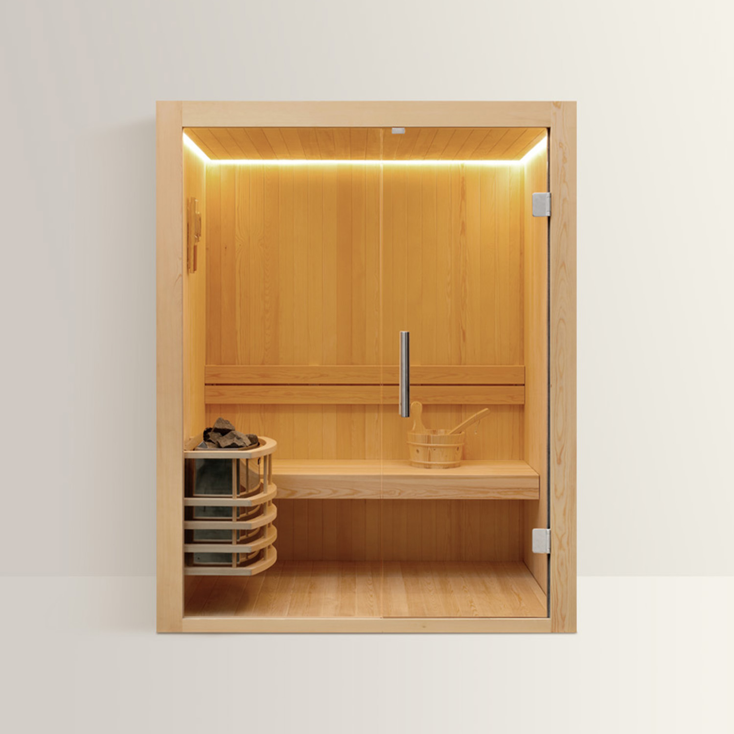 La sauna finlandese Zermatt è un modello rettangolare perfettamente collocabile a centro parete ed è disponibile in 3 differenti misure per venire incontro alle esigenze di ogni spazio abitativo.