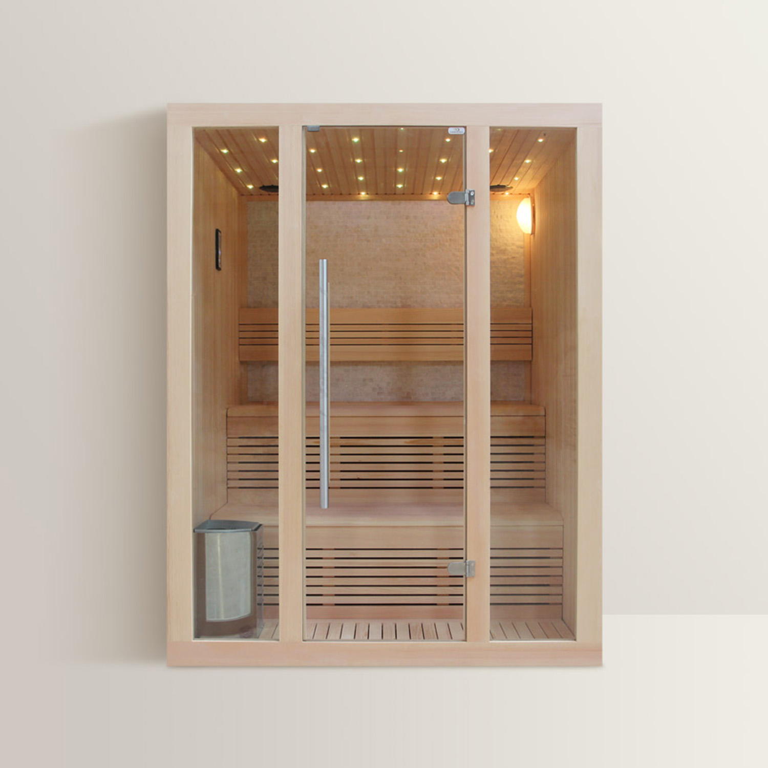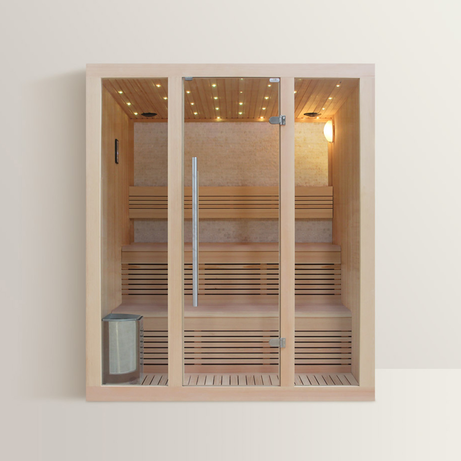 La sauna rettangolare Chamonix, perfetta per essere posizionata a parete, offre eccellenti funzionalità con il minimo ingombro: nella versione da 160 cm permette di ospitare più di una persona grazie alla doppia seduta interna rialzata che ottimizza al meglio gli spazi interni. Il design elegante e raffinato della sauna finlandese Chamonix si apprezza nella cura dei dettagli e nei materiali utilizzati: realizzata interamente in legno di pino, che gli conferisce resistenza e solidità, questo prodotto è dotato di porta in cristallo da 8mm che ne impreziosisce l’aspetto La grande parete posteriore della sauna Chamonix e il particolare in pietra bianca della stufa finlandese all’interno aggiungono classe all’intera struttura.