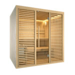 Garmisch è una sauna finlandese di grandi dimensioni, realizzata in pino bianco finlandese, con un design elegante e moderno. La prete frontale è realizzata in cristallo, con inserti in legno. Le ampie sedute sovrapposte, ampie e confortevoli, possono ospitare fino a 6 sedute.