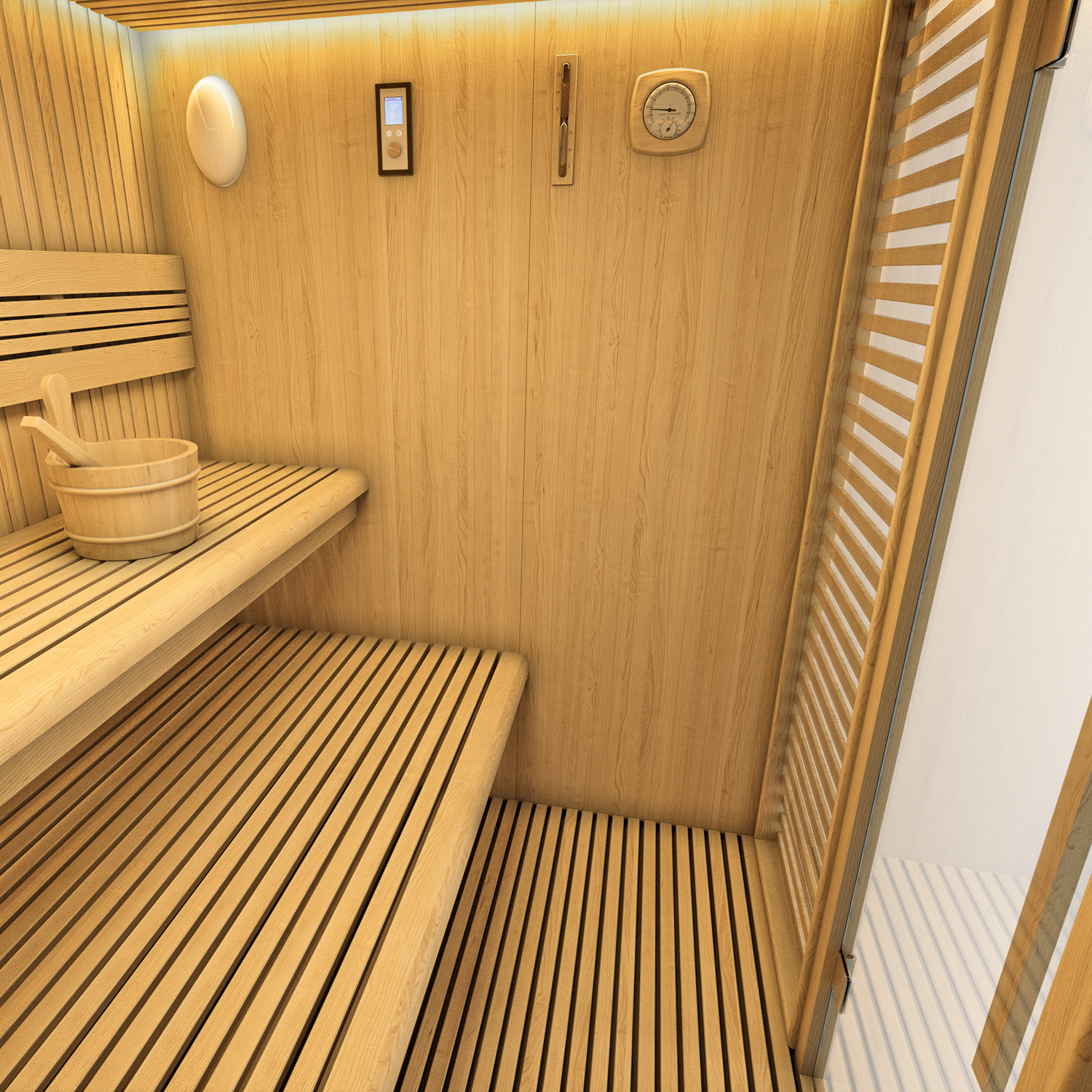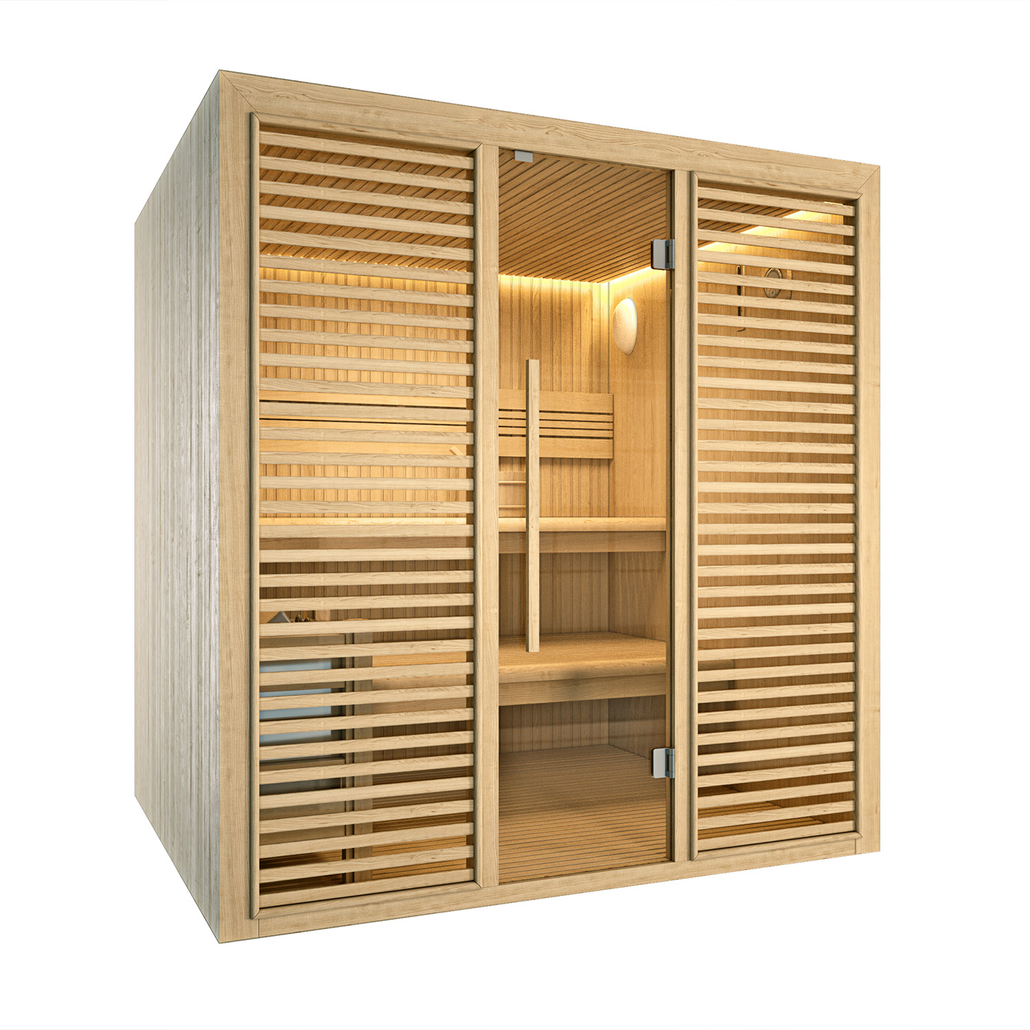 Garmisch è una spaziosa sauna finlandese in pino bianco finlandese, dal design moderno ed elegante. I cristalli adiacenti alla porta sono arricchiti da inserti in legno per maggiore privacy, mentre le sedute sovrapposte sono ampie e confortevoli.