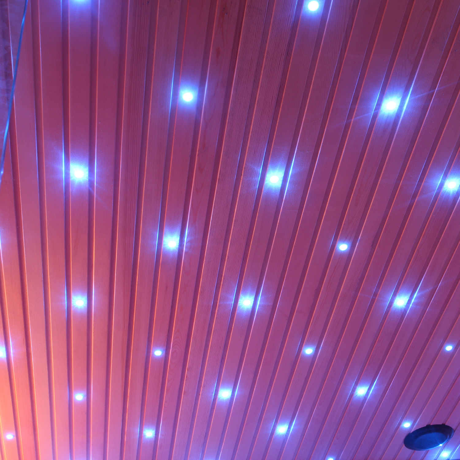 L’interno della Sauna Lugano è impreziosito dalla sua lucentezza e dalla sua qualità per una grande parete in pietra cristallizzata oltreché per le sue ampie sedute a più piani larghe 50 cm. L’illuminazione interna di questa splendida Sauna Finlandese è dotata di paralume in legno ed è impreziosita dalla cromoterapia presente sul tetto con oltre 50 mini led multicolore.