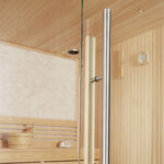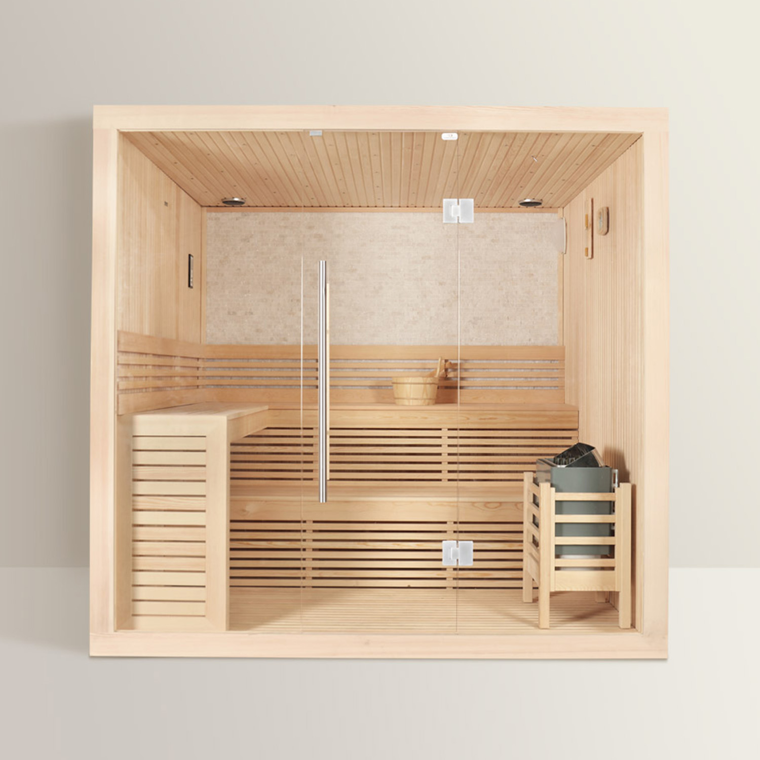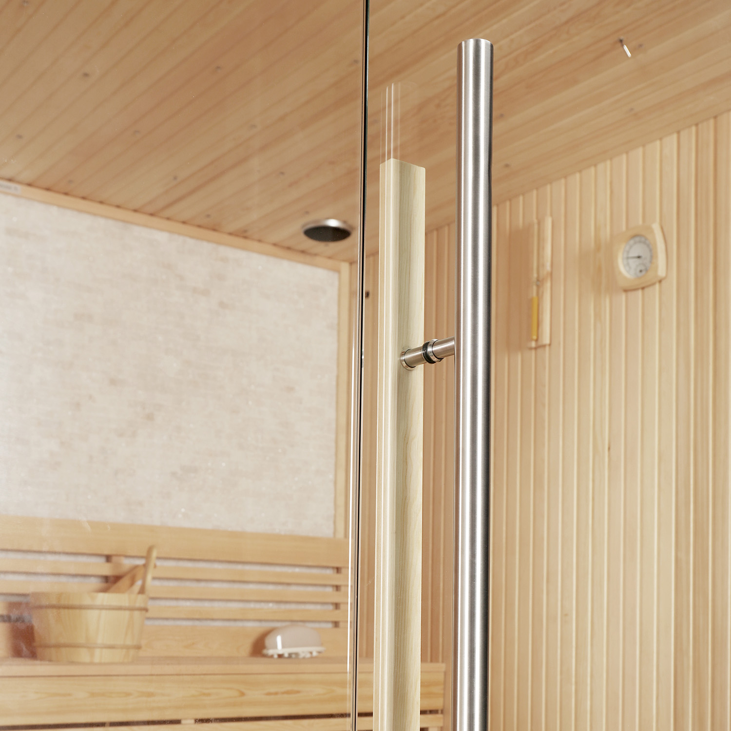 La Sauna Finlandese Lugano è un modello rettangolare tra i top di gamma, realizzata in legno di pino bianco finlandese da 46 mm. È caratterizzata da una parete in cristallo temprato di sicurezza spesso 8 mm.