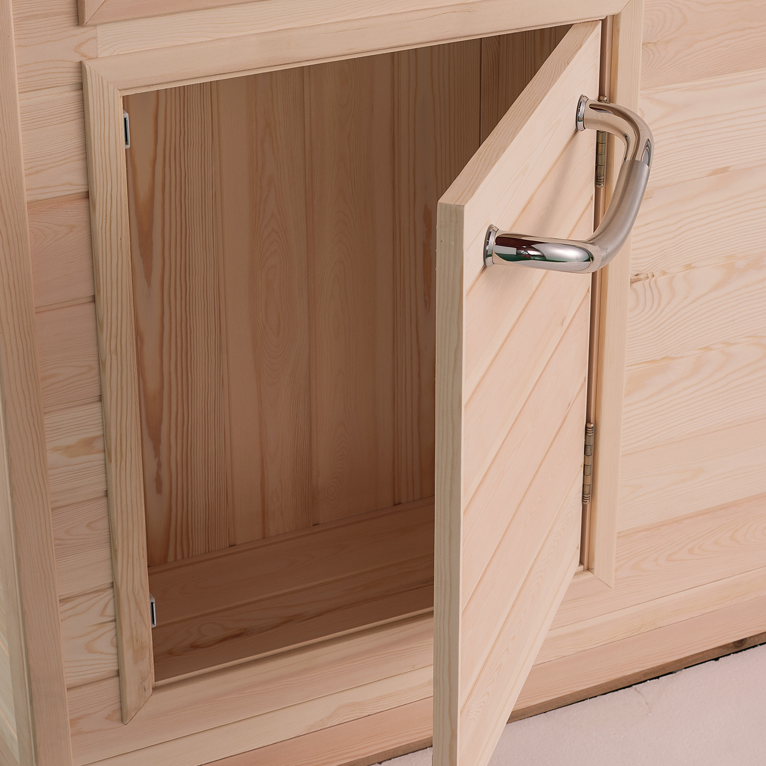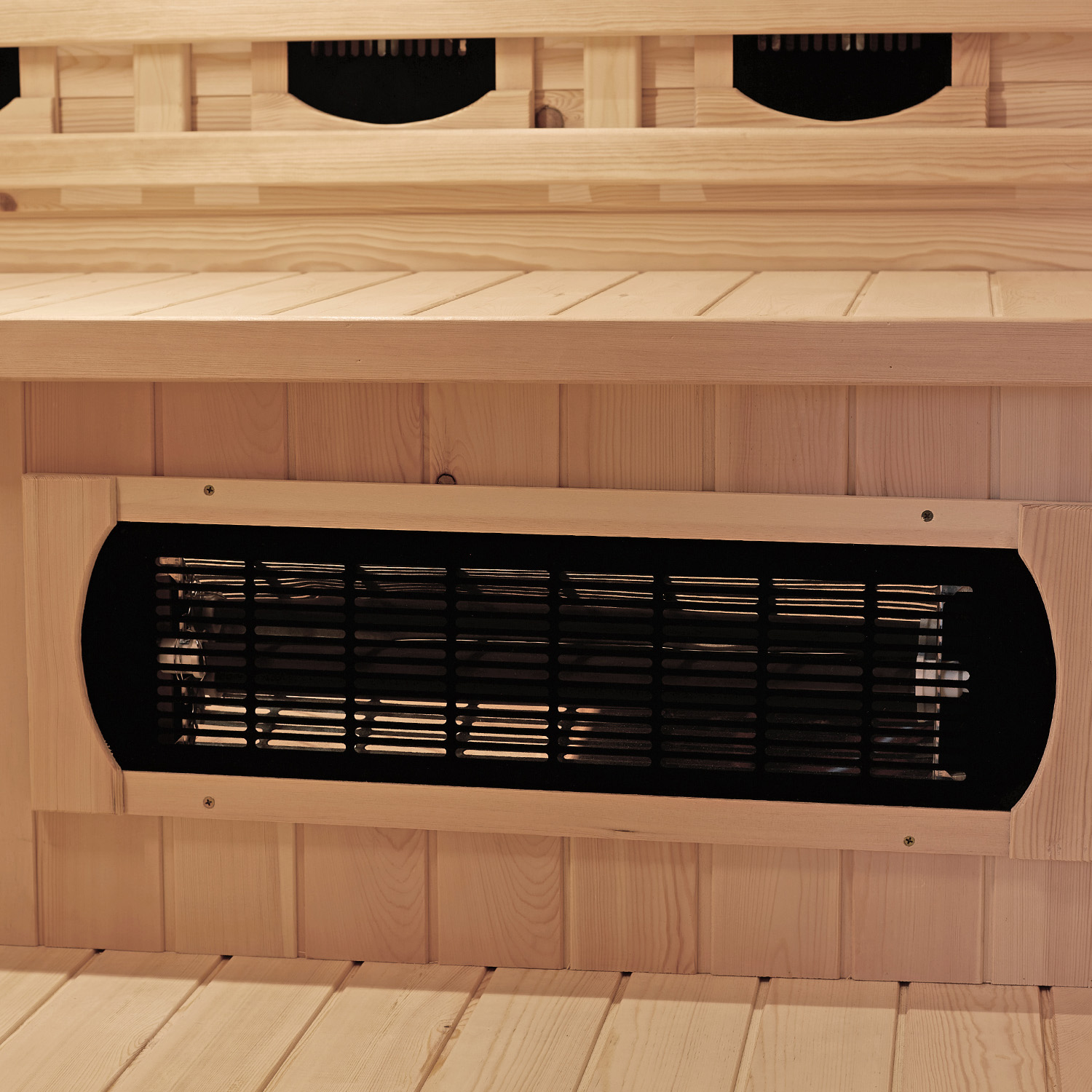 Ideale per ospitare più persone contemporaneamente, in posizione seduta, la sauna per casa Roma concilia estetica e funzionalità: la sua struttura è realizzata in legno di pino bianco originale finlandese, come tutti i prodotti Dimhora, che assicura resistenza e solidità. La porta in cristallo di 8 mm permette un agevole ingresso in sauna, mentre l’eccellente illuminazione interna rende più piacevole ogni seduta, aumentando il comfort.