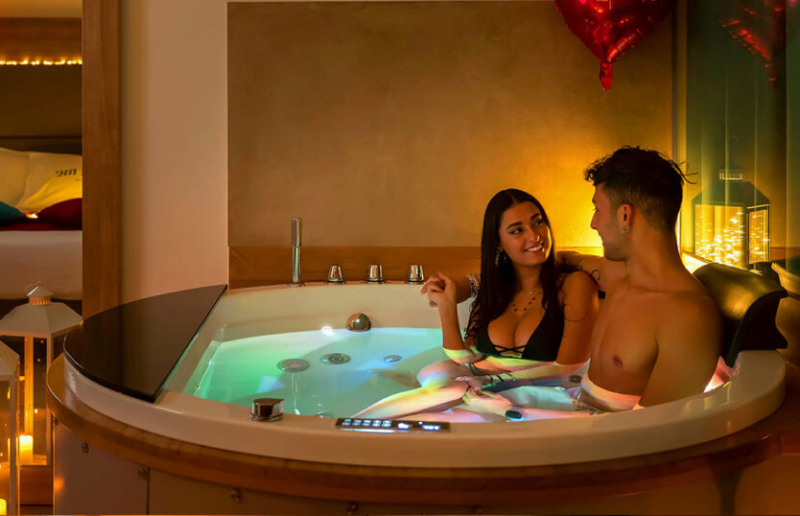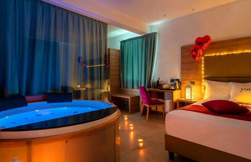 L’idea alla base del nostro hotel si basa proprio sulla voglia di coccolarsi dei nostri clienti. L’abbiamo chiamato You & Me (riportando a me e mia moglie), poiché è tutto dedicato alle coppie e alla loro voglia di stare bene insieme. Ogni dettaglio è studiato sulla dualità, ogni cosa che c’è al suo interno è fatta da 2 cose, un esempio, in tutte le Suite ci sono 2 soffioni doccia cromoterapici per permettere alle coppie di fare la doccia assieme. (In foto, la vasca idromassaggio Scrigno)