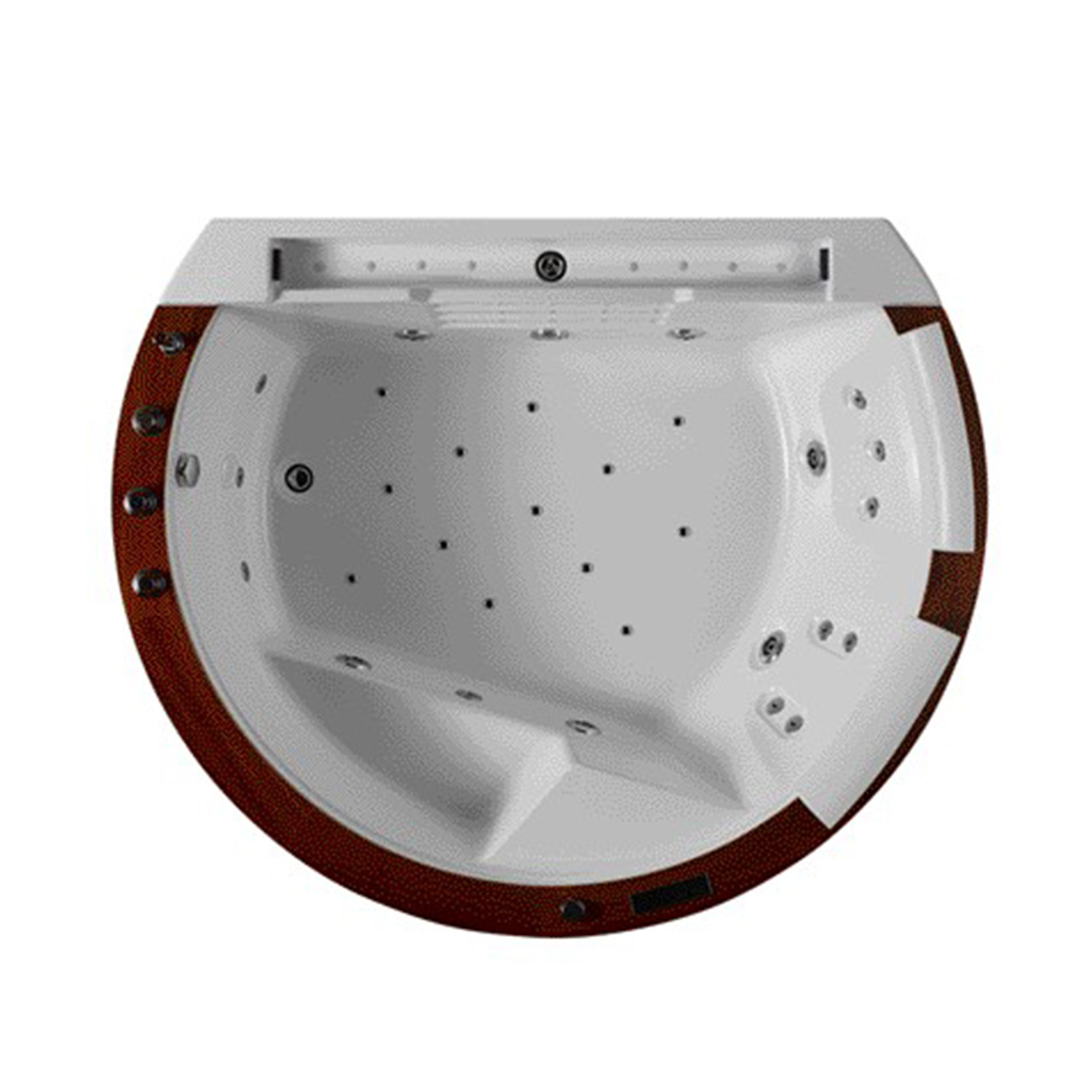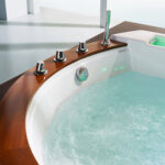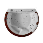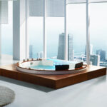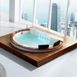 La vasca idromassaggio Scrigno, con il suo design circolare e asimmetrico, è un modelli più innovativi del catalogo Dimhora. La bordatura in legno massello aggiunge un tocco di esclusività, rendendola ideale per arricchire qualsiasi ambiente.