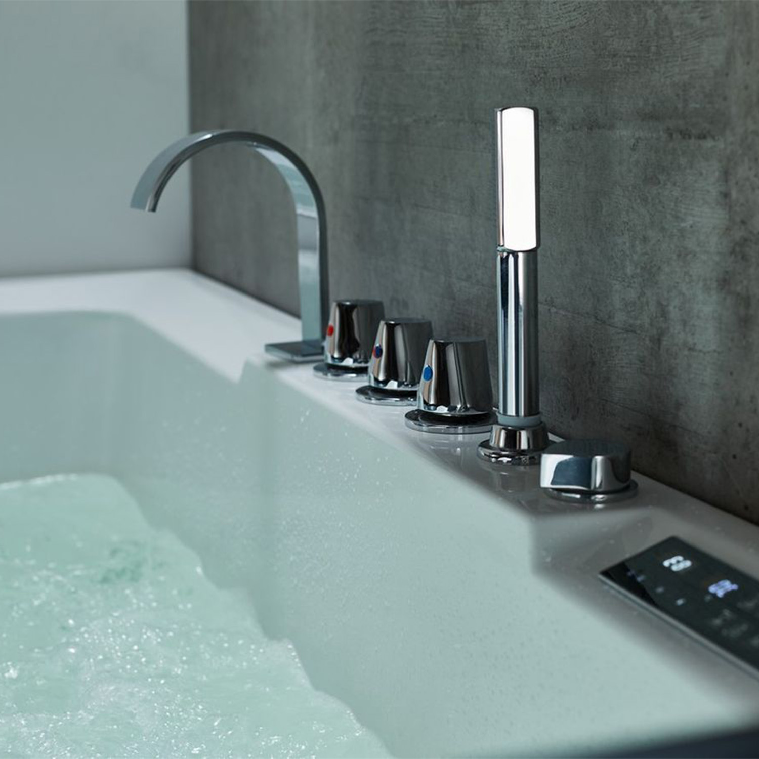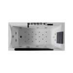 L’idromassaggio, con 27 bocchette sono distribuite lungo la vasca in modo da agire su tutto il corpo con un doppio massaggio ad aria e ad acqua. Imperdibile l’illuminazione multicolor, che consente delle rilassanti sedute di cromoterapia, e la radio FM per accompagnare la seduta con buona musica. Tutte le funzionalità sono facilmente controllabili e regolabili dal display. Completano le dotazioni della vasca la rubinettereia con doccino estraibile di serie e lo scarico, in ottone cromato. È possibile posizionare l’idromassaggio a centro parete, richiedendone la realizzazione con un pannello aggiuntivo lato piedi.