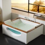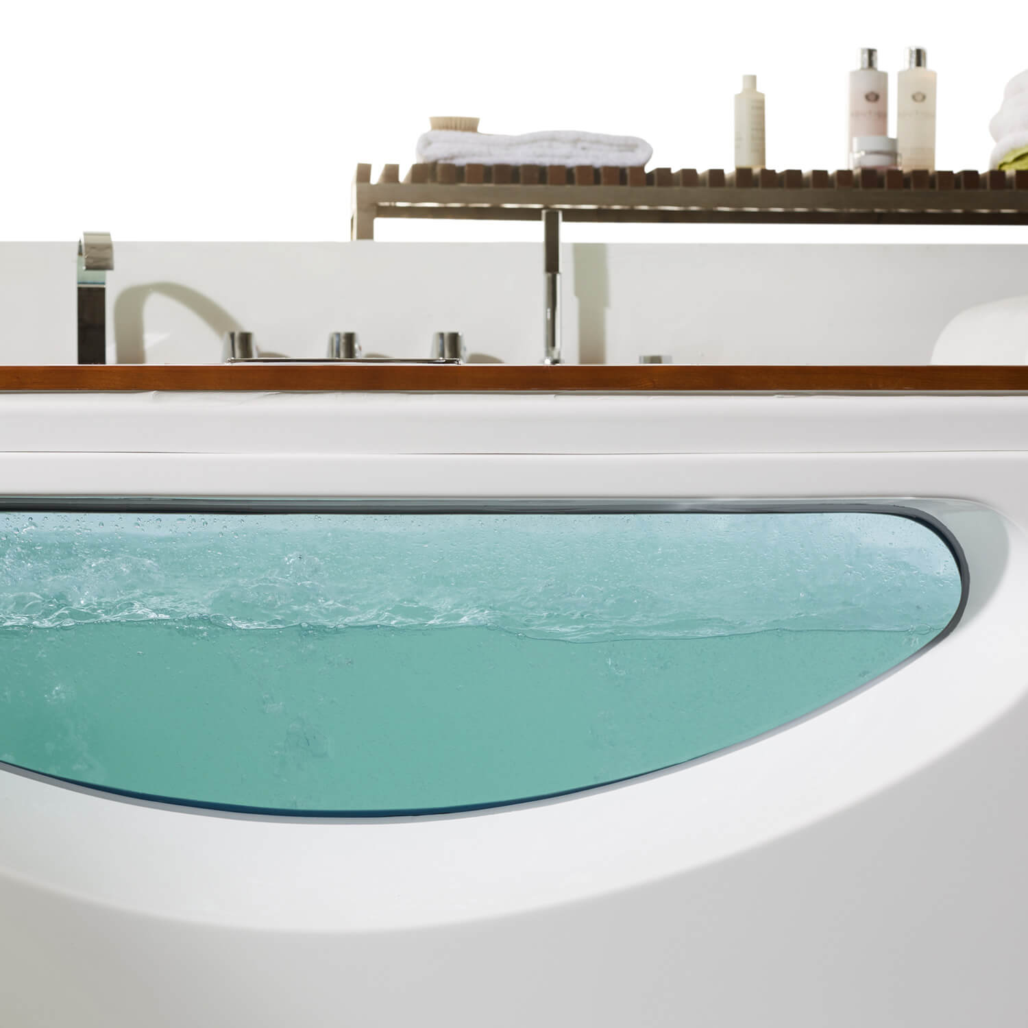Facile da installare in ogni contesto, domestico o professionale, la vasca idromassaggio Eolie è un modello a due posti caratterizzato da forme regolari, finestra in cristallo sulla parete e rivestimento in legno massello.